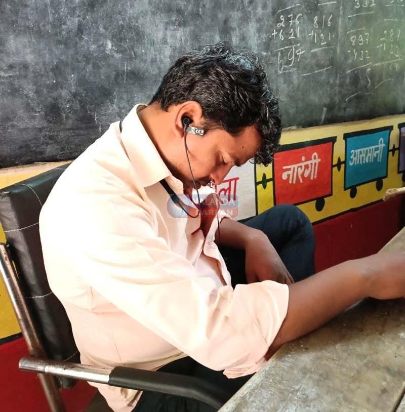 तीसरी तस्वीर में शिक्षक कान में ईयरफोन लगाए, सिर झुकाकर मोबाइल या किसी डिवाइस पर ध्यान केंद्रित किए हुए हैं। शायद वे संगीत सुन रहे हों या वीडियो देख रहे हों, लेकिन क्लासरूम में यह व्यवहार पूरी तरह अनुचित है।