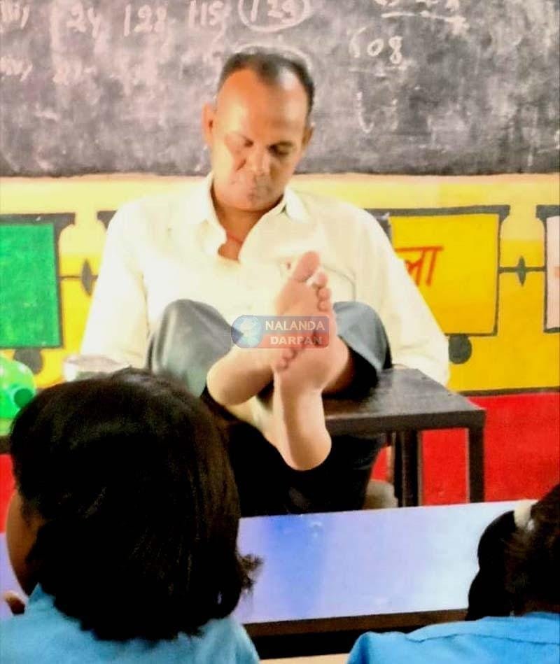 ब्लैकबोर्ड पर गणित की साधारण गणनाएं जैसे जोड़, घटाव और गुणा-भाग के उदाहरण अंकित हैं, लेकिन शिक्षक की भूमिका कहीं नजर नहीं आती। पहली तस्वीर में शिक्षक अपनी डेस्क पर पैर को ऊपर उठाकर आराम की मुद्रा में हैं । जबकि सामने बैठे बच्चे नोटबुक में लिख रहे हैं। उनकी आंखें बंद हैं और चेहरा थका हुआ लग रहा है। मानो क्लास लेने की बजाय वे खुद ही पढ़ाई कर रहे हों।