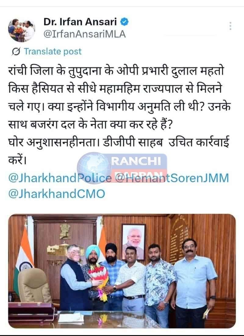 उन्होंने एक्स पर पोस्ट किया, ‘रांची जिला के तुपुदाना के ओपी प्रभारी दुलाल महतो किस हैसियत से सीधे महामहिम राज्यपाल से मिलने चले गए। क्या इन्होंने विभागीय अनुमति ली थी? उनके साथ बजरंग दल के नेता क्या कर रहे हैं? घोर अनुशासनहीनता। डीजीपी साहब उचित कार्रवाई करें।’